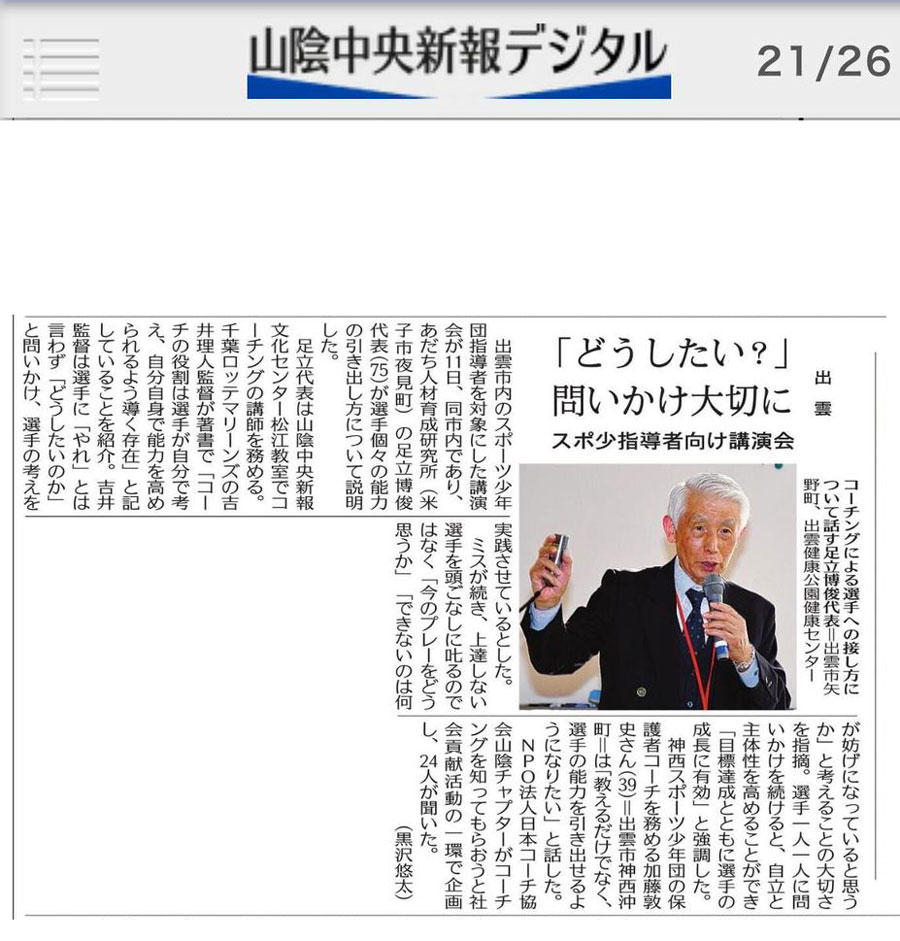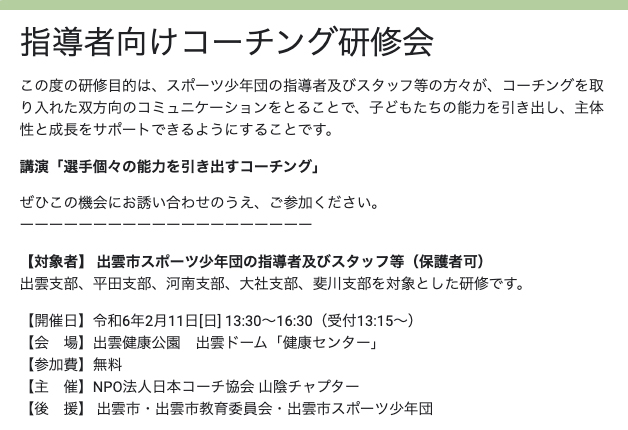 社会貢献活動『指導者向けコーチング研修会』 〜 出雲市の少年スポーツ少年団 指導者を対象 〜 受付けは終了しました。 山陰中央新報新聞に掲載されました。 山陰中央新報 2024年2月12日に掲載(※山陰中央新報社の許可を得て掲載しております)